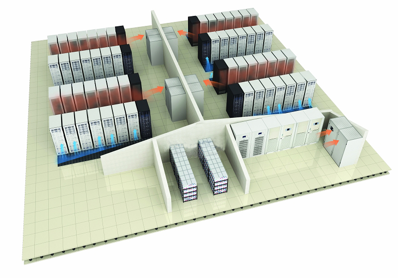????? 2、環境控制系統,通常選用機房精密空調對數據中心的環境調節,確保服務器等IT設備的運行環境。對于發熱量大的服務器等IT設備,通常選用高通孔率(一般大于70%)網孔門的機柜,提高機柜進出風量;將機柜面對面、背對背布置,在機房內形成冷熱隔離的風道,提高制冷效率;空調采用下送風方式,確保機房送風均勻,提高制冷效率。