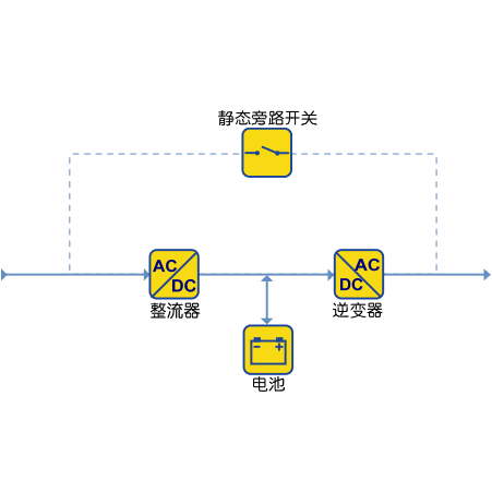 ? ??這是10KVA以上功率范圍的電源最常用的UPS類型。在雙轉(zhuǎn)換在線式UPS的結(jié)構(gòu)圖中,除了主電源路徑是逆變器(而非交流主電源)外,其余與后備式設(shè)計(jì)相同。
